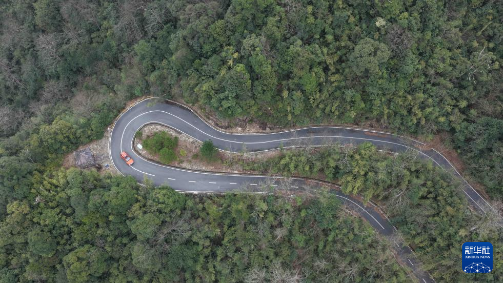 3月17日,广东省乳阳林场八宝山管护站护林员驾驶车辆在南岭山脉公路上行驶(无人机照片)。新华社记者 邓华 摄