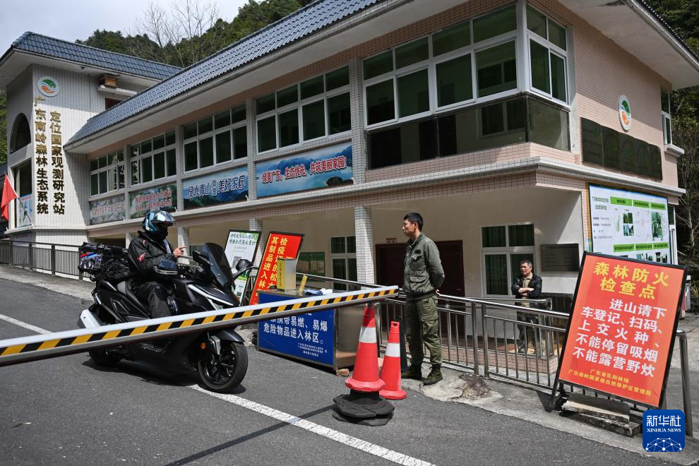 3月17日,广东省乳阳林场八宝山管护站负责人周智鹏(中)与来自湖南的自驾游客交流并宣传防火常识。新华社记者 邓华 摄