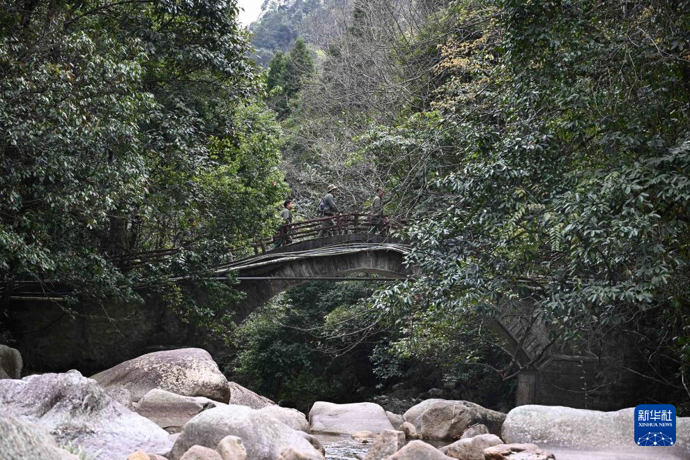 3月17日,广东省乳阳林场八宝山管护站护林员在巡山路上途经河流。新华社记者 邓华 摄