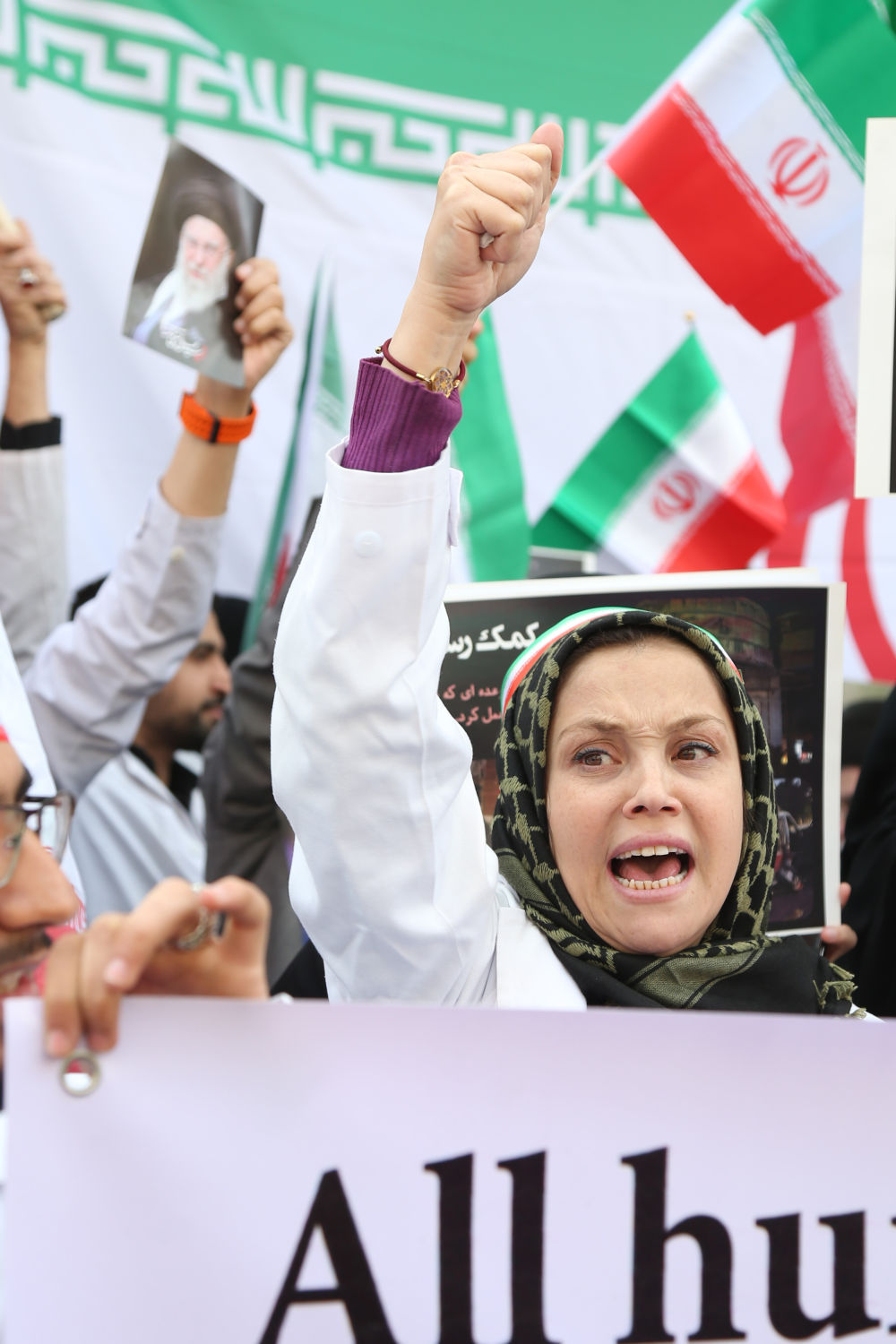 3月7日,在伊朗首都德黑兰,医护人员在遭袭的甘地医院前参加集会,强烈抗议美国和以色列对伊朗医院等机构的袭击。甘地医院在美国和以色列1日发动的空袭中被击中。