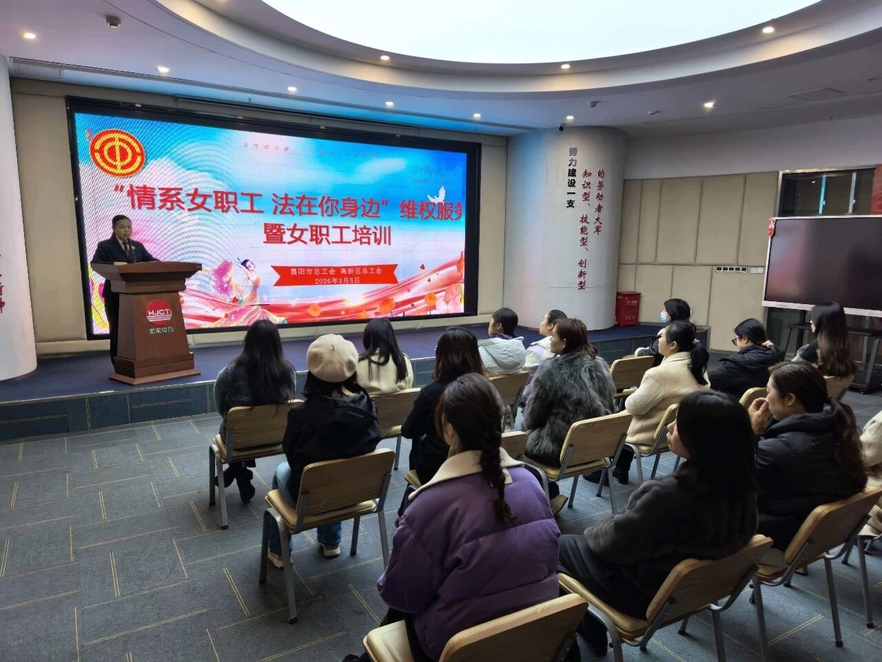 襄阳市总工会、高新区总工会在汉江双创产业园联合举办维权服务暨女职工培训活动。工作人员围绕《妇女权益保障法》《女职工劳动保护特别规定》等法律,以趣味竞答形式开展授课;旗袍协会形体礼仪老师则带来职场形象、公务礼仪、沟通社交等互动教学。现场还向女职工赠送了女性成长、职场提升等书籍,帮助大家在轻松氛围中提升法律意识与职业素养。