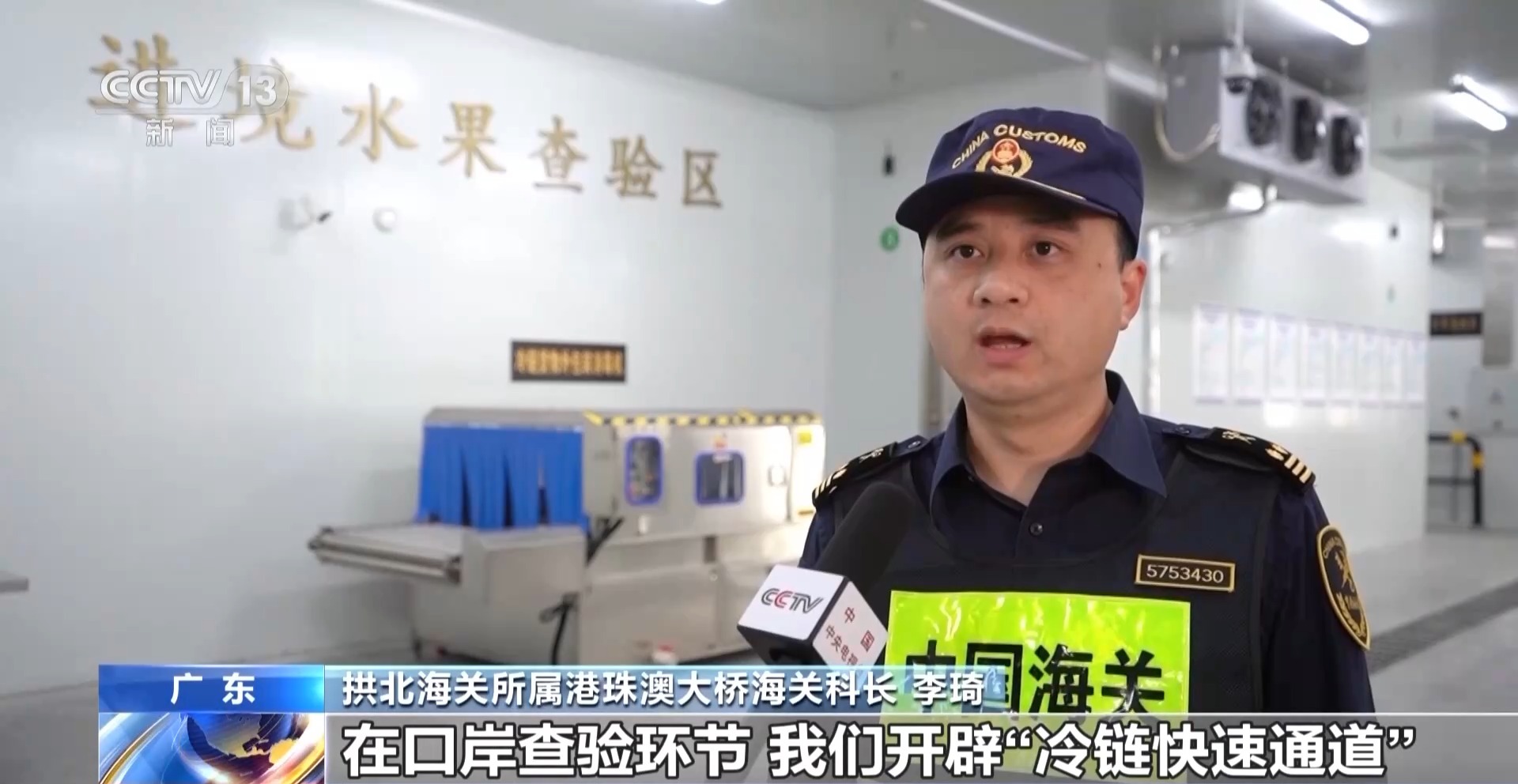 拱北海关所属港珠澳大桥海关科长 李琦:在口岸查验环节,我们开辟“冷链快速通道”,实现空运与陆运环节无缝衔接,大幅提升了通关效率。