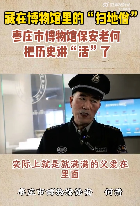 在枣庄市博物馆,65岁的保安何清是三楼展厅的“明星”。