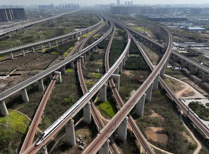 在河南省郑州市拍摄的纵横交错的高铁线路(无人机照片)。新华社记者 李嘉南 摄