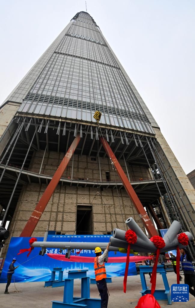 3月28日,伴随重约7.6吨的菱形钢结构部件升到约596米高的楼顶,天津“117项目”的“钻石顶”的首个钢结构部件吊装成功,标志着该项目进入塔冠钢结构全面施工阶段。