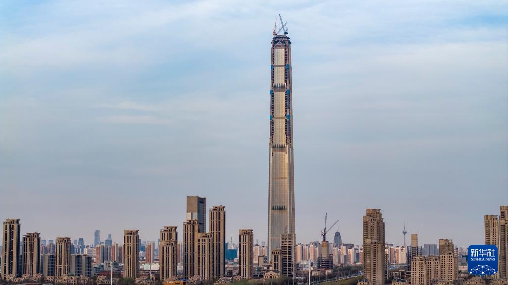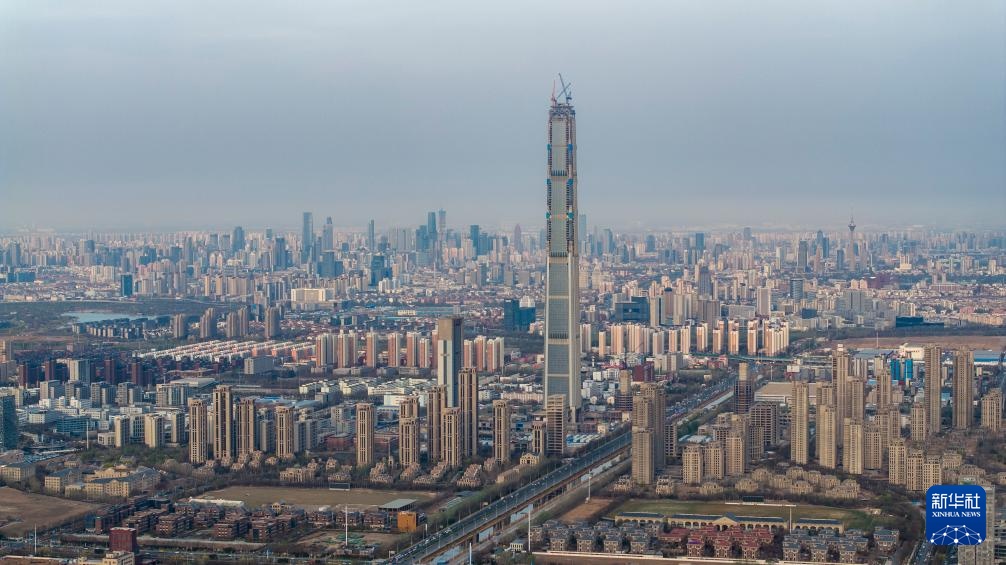 3月28日,在天津“117项目”楼顶,工作人员查看吊装成功的菱形钢结构部件。新华社记者 赵子硕 摄