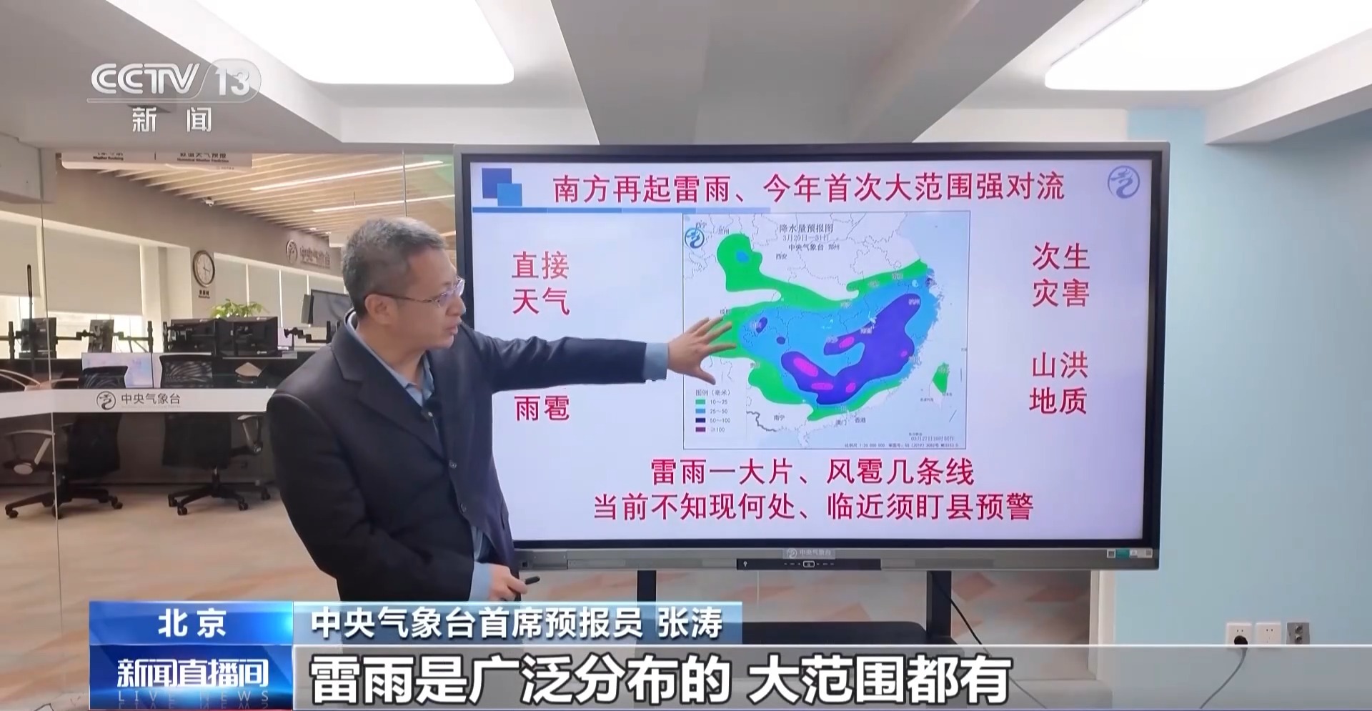 中央气象台首席预报员 张涛:为什么会有这样一次大范围的强对流过程,简单来说就是:现在春分已经过了,太阳的火力会非常猛,海洋上的水汽蒸发越来越多,大陆上被晒暖之后,海洋上的水汽就会向大陆上来汇聚,这是一个总体原理。