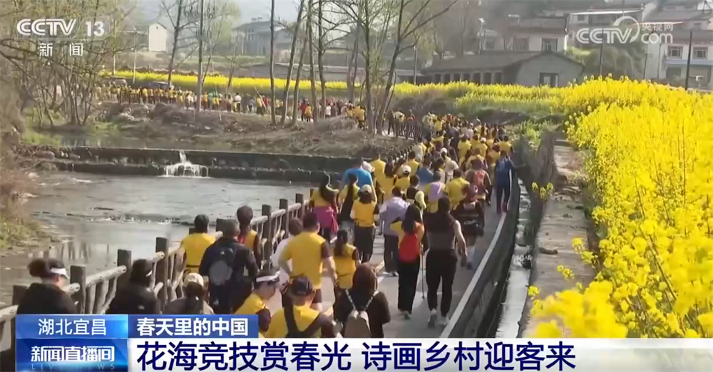 央视网消息:阳光正好,暖风拂面,湖北省宜昌市夷陵区万亩油菜花如约绽放,金黄的花田与青山绿水、古朴村落相映成趣,绘就了一幅生机勃勃的春日画卷。