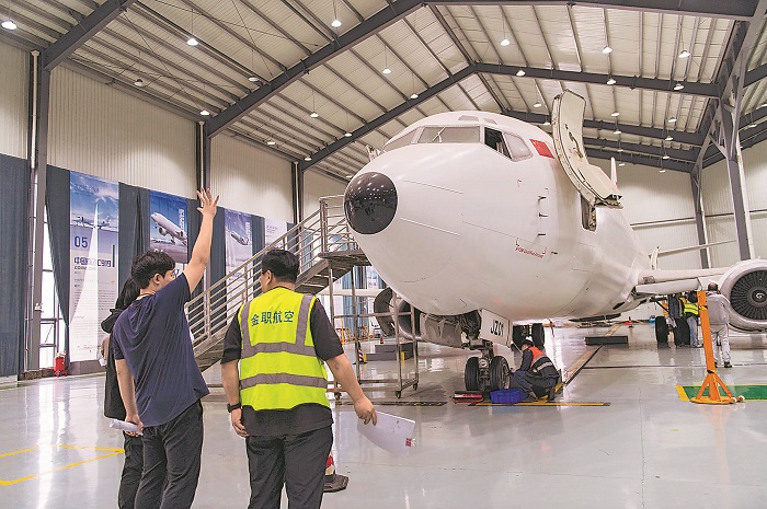 3月30日,学员在浙江省金华职业技术大学航空维修培训中心练习“飞机拜拜员”的工作流程。该校飞机机电设备维修专业自2020年开设以来,学生在校即可参加民用航空器维修人员执照考证,拿下航空维修行业的“敲门砖”,多家航空公司已提前下单,要求定向培养。本报通讯员 胡肖飞 摄