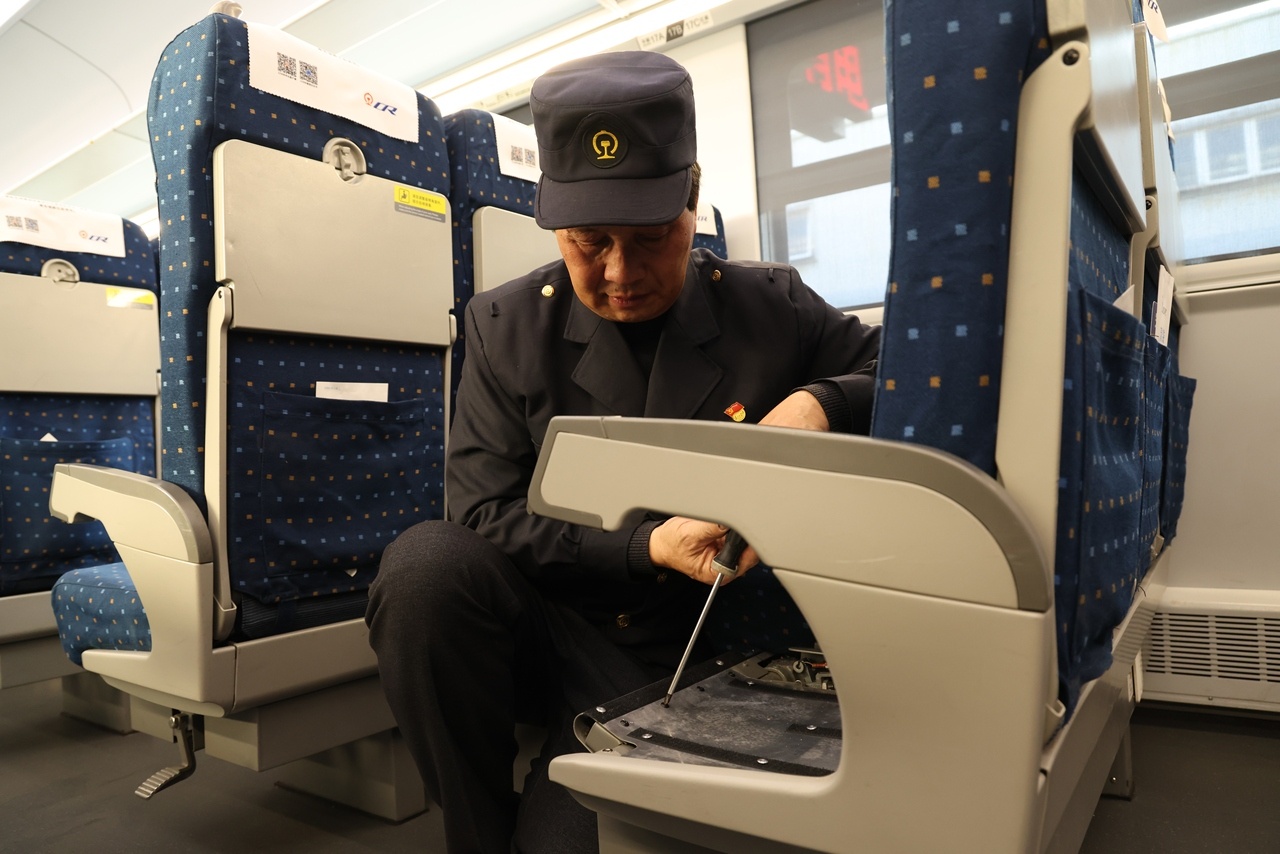 “我们每天排查、校调多达40节车厢、4000多个座椅都需要人工检查,并实时维修”,日行两万多步、低头下蹲上千次,这已是陈明州的常态,有时吃饭都是在检修间隙匆匆扒几口,便立刻返回岗位。“时间不等人,列车检修卡得紧,多耽搁一分钟,都可能放过一个故障座椅”,陈明州说。