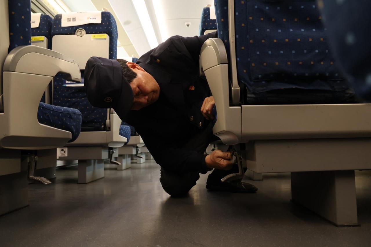 9时49分,陈明州动作干练利落,手电筒光在一排排座椅间穿梭,手掌抚过靠背,不时停驻、弯腰、俯身、半蹲,甚至趴在地上,拧紧螺丝、调整螺杆。此时他已完成3节车厢354个座椅的校调,灰白色泥印在衣服袖口、裤子膝盖上格外显眼。