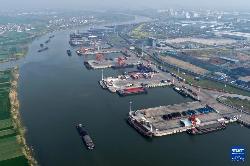 这是3月31日拍摄的周口港中心港区中心作业区码头(无人机照片)。新华社记者 李嘉南 摄