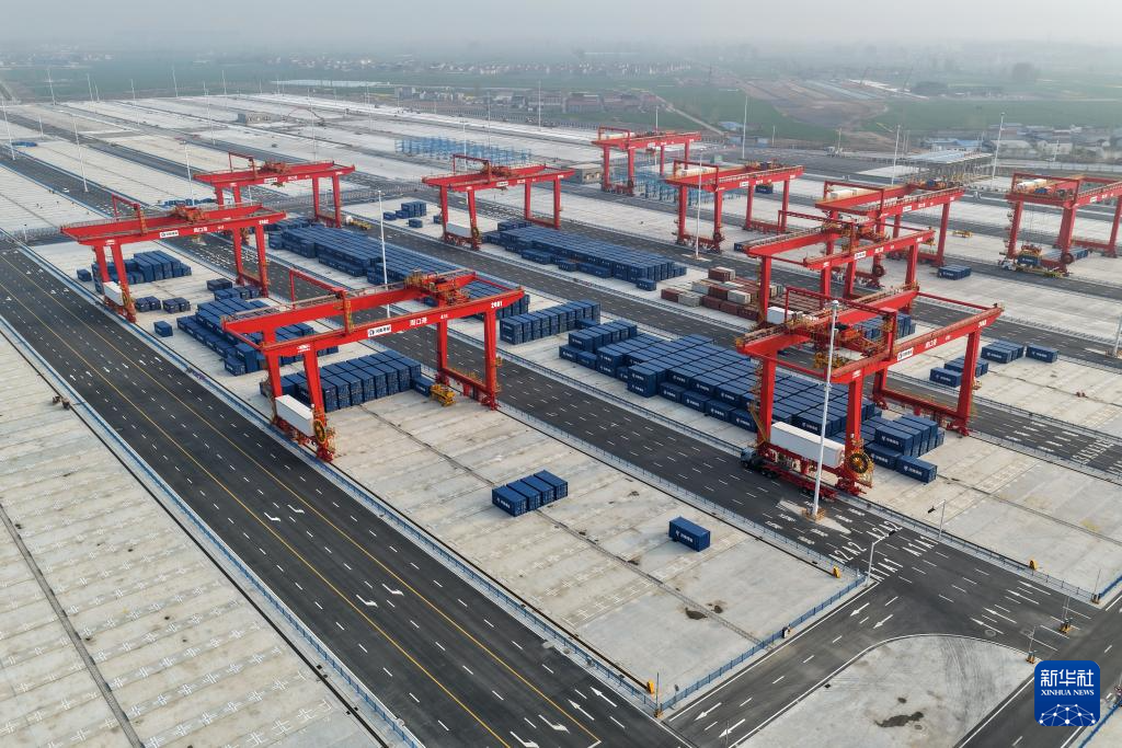 这是3月31日拍摄的周口港中心港区中心作业区堆场(无人机照片)。新华社记者 李嘉南 摄
