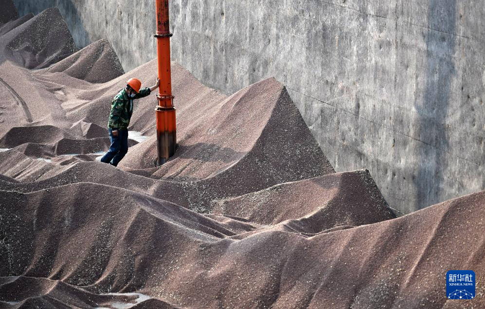 3月31日,码头工人在周口港中心港区范营作业区卸货。新华社记者 李嘉南 摄