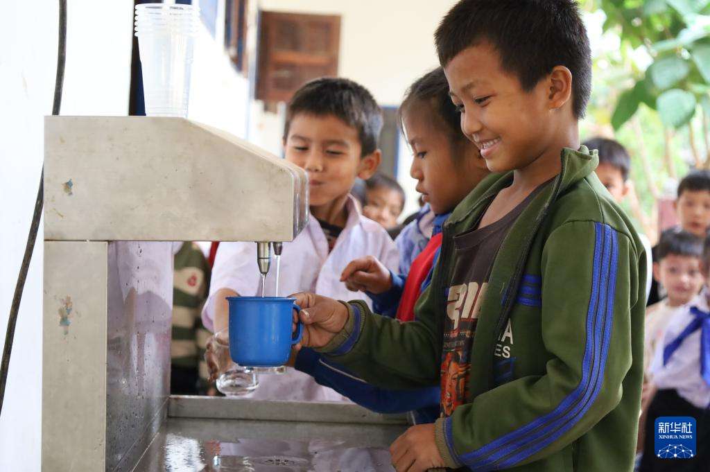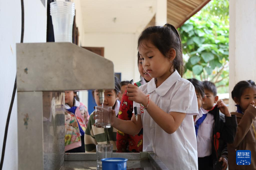 3月11日,在老挝琅勃拉邦省哈克村,学生通过净水设备接取饮用水。新华社记者 马淮钊 摄