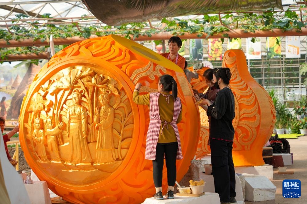 4月1日,在寿光市蔬菜高科技示范园,工作人员进行菜博会布展工作。新华社记者 徐速绘 摄