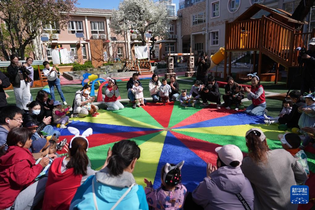 4月1日,在北京市第五幼儿园亲子托育活动现场,家长和孩子在老师引导下参加户外活动。新华社记者 谢晗 摄