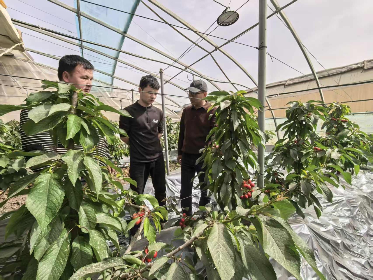 设施农业大棚里,饱满多汁的车厘子挂满枝头。技术员图然托合提·阿卜杜艾尼正忙着开展采摘前管护工作,他介绍,今年在中国科学院新疆生态与地理研究所正高级工程师王平的指导下,园区管理精细、气候条件适宜,车厘子产量稳定,果实糖度高、口感脆甜,品质十分出众。