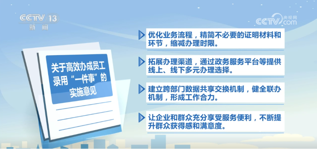 央视网消息:近日,人力资源社会保障部办公厅、住房城乡建设部办公厅、国家医保局办公室联合印发《关于高效办成员工录用“一件事”的实施意见》(以下简称《意见》)。将员工录用相关的多项关联业务整合为“一件事”办理,通过减环节、减材料、减时限、减跑动,实现一站式联办,大幅方便企业和群众。