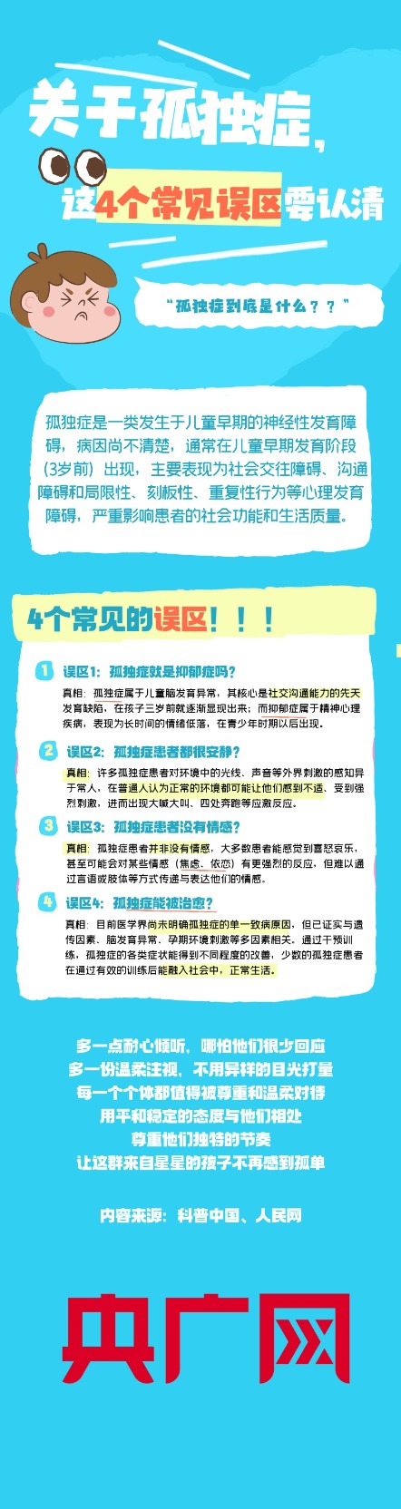 央广网北京4月2日消息(记者 郭彦伟 实习记者 何嘉琪)有这样一群孩子,他们像夜空中孤独闪烁的星星,安静地活在自己的世界里。他们会固执地重复着手中的小事,却有着一双格外澄澈纯粹的眼睛。人们温柔地称他们为 “星星的孩子”,也常常因他们与众不同的行为而产生误解。什么是孤独症?关于孤独症,有哪些常见误区?戳图了解↓↓↓
