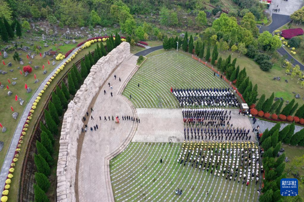 4月2日,在广西全州县红军长征湘江战役纪念园凭吊广场,人们在祭奠红军英烈(无人机照片)。新华社记者 陆波岸 摄