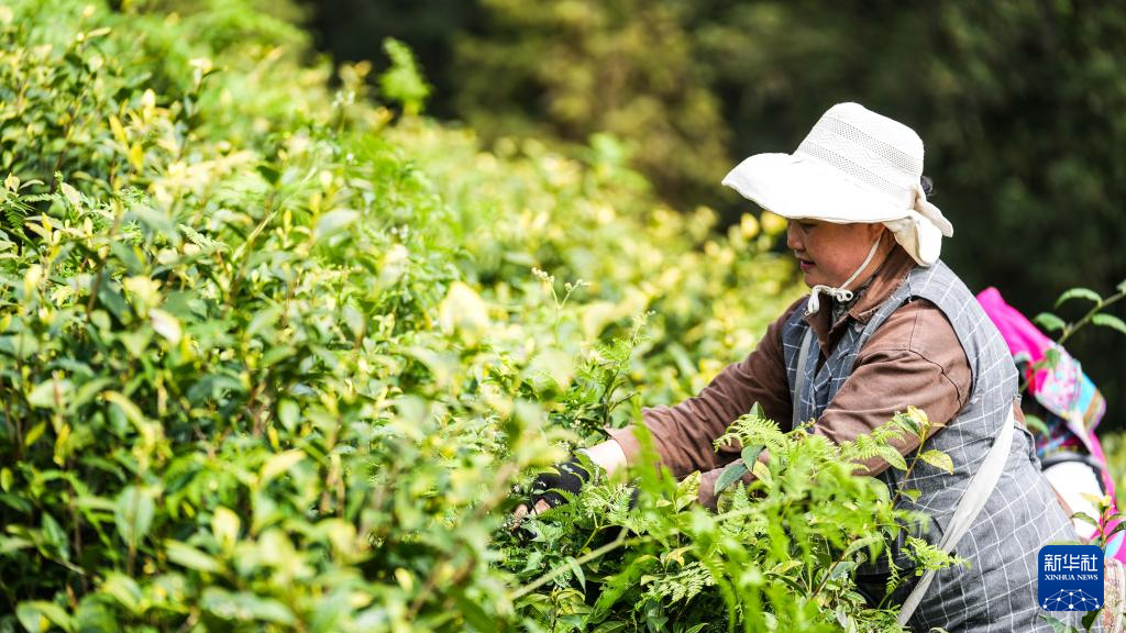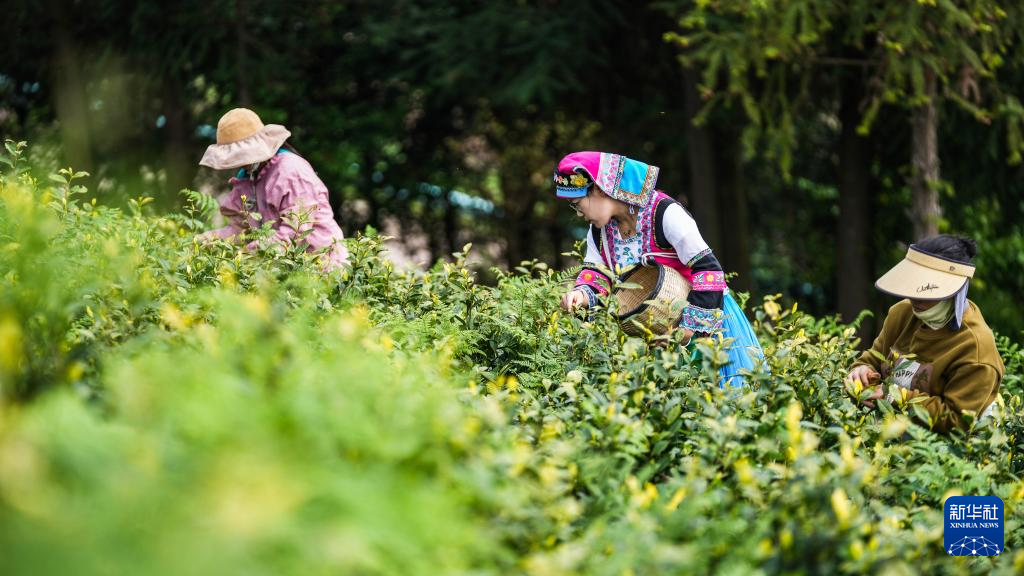 4月2日,茶农在六盘水市六枝特区月亮河彝族布依族苗族乡的茶山采摘春茶。新华社记者 陶亮 摄
