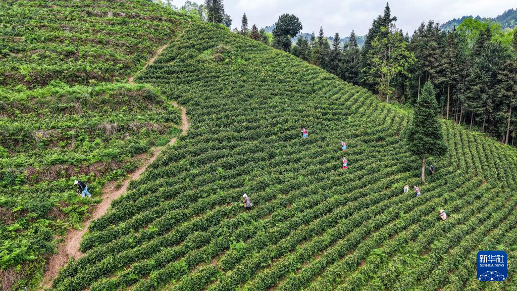 4月2日,茶农在六盘水市六枝特区月亮河彝族布依族苗族乡的茶山采摘春茶(无人机照片)。新华社记者 陶亮 摄