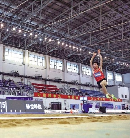3月29日,陕西队选手陈世桦锐在比赛中。他获得季军。当日,2026年全国室内田径锦标赛男子三级跳远决赛在山东省济南市举行。新华社记者 雒圆摄