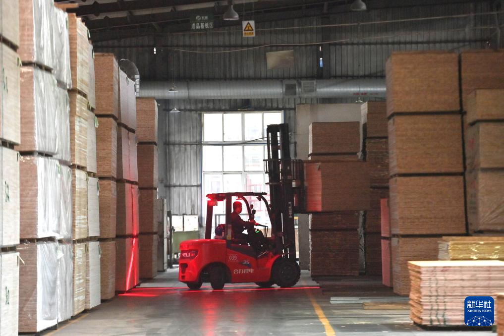 在柳州市融安县一家香杉板材生产企业,工人驾驶叉车搬运板材(4月1日摄)。新华社记者 黄孝邦 摄