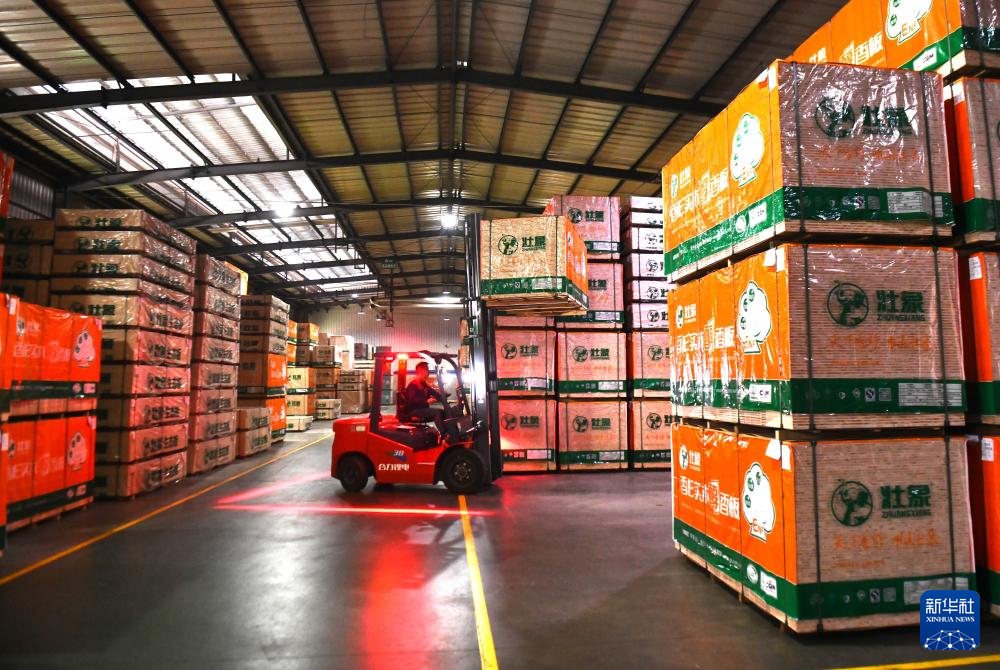 柳州市融安县一家香杉板材生产企业,工人在库房作业(4月1日摄)。新华社记者 黄孝邦 摄