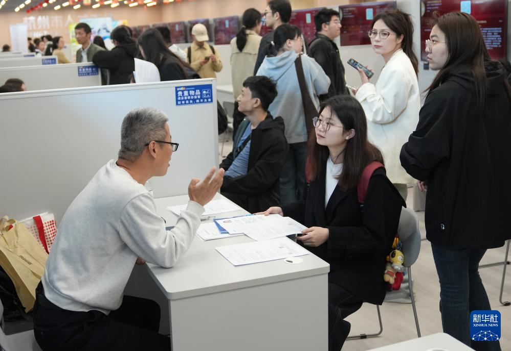 4月2日,求职者与参会企业工作人员在杭州市高校毕业生就业专场招聘会上洽谈。新华社记者 韩传号 摄