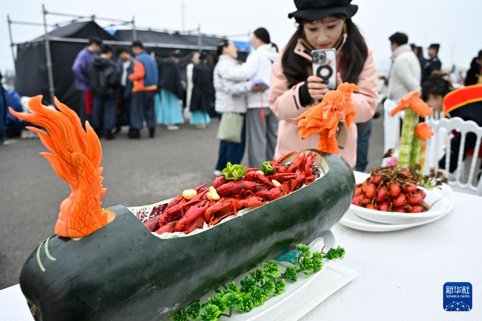 4月3日,一名女士在龙虾开捕仪式活动现场拍摄小龙虾菜品。新华社记者 季春鹏 摄