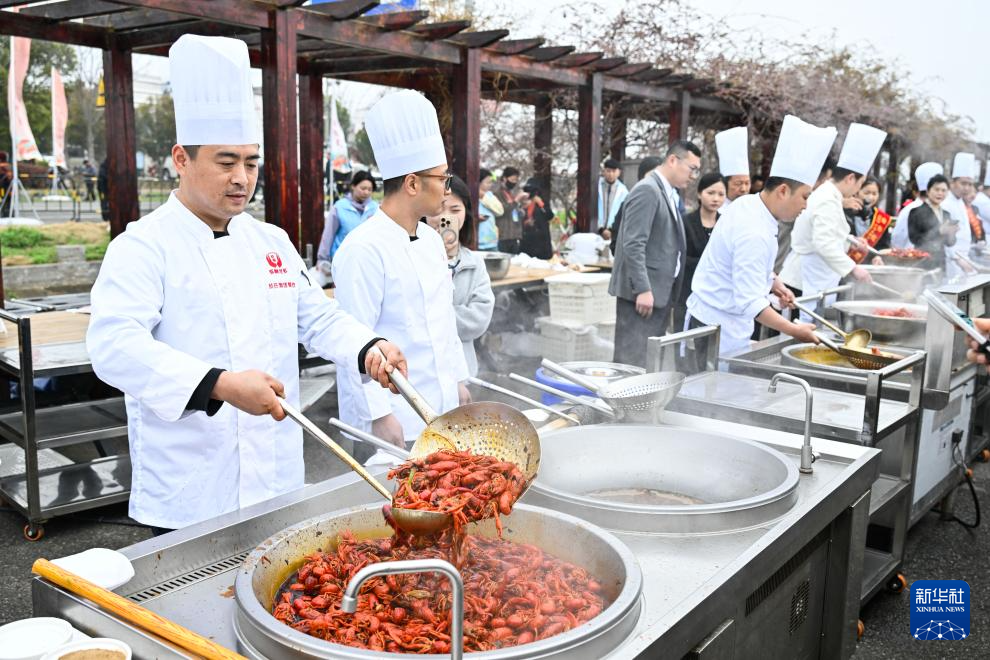 4月3日,厨师在龙虾开捕仪式活动现场烧制小龙虾。新华社记者 季春鹏 摄