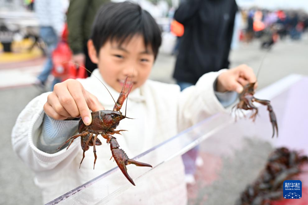 4月3日,小朋友在龙虾开捕仪式活动现场展示头网小龙虾。新华社记者 季春鹏 摄
