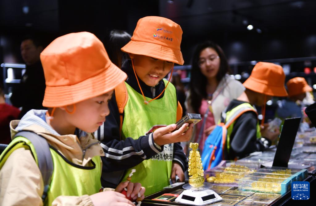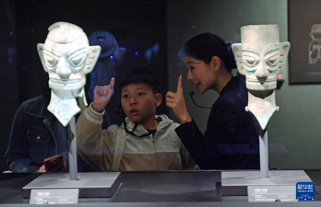 4月3日,小朋友在三星堆博物馆观看展品。新华社记者 卢哲 摄