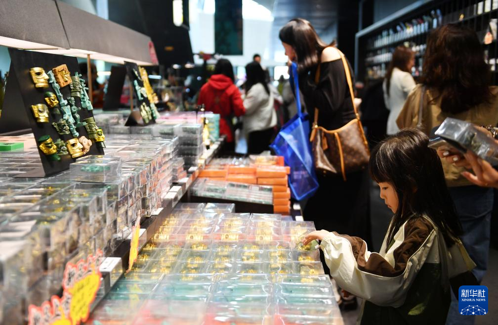 4月3日,小朋友在三星堆博物馆挑选文创纪念品。新华社记者 卢哲 摄