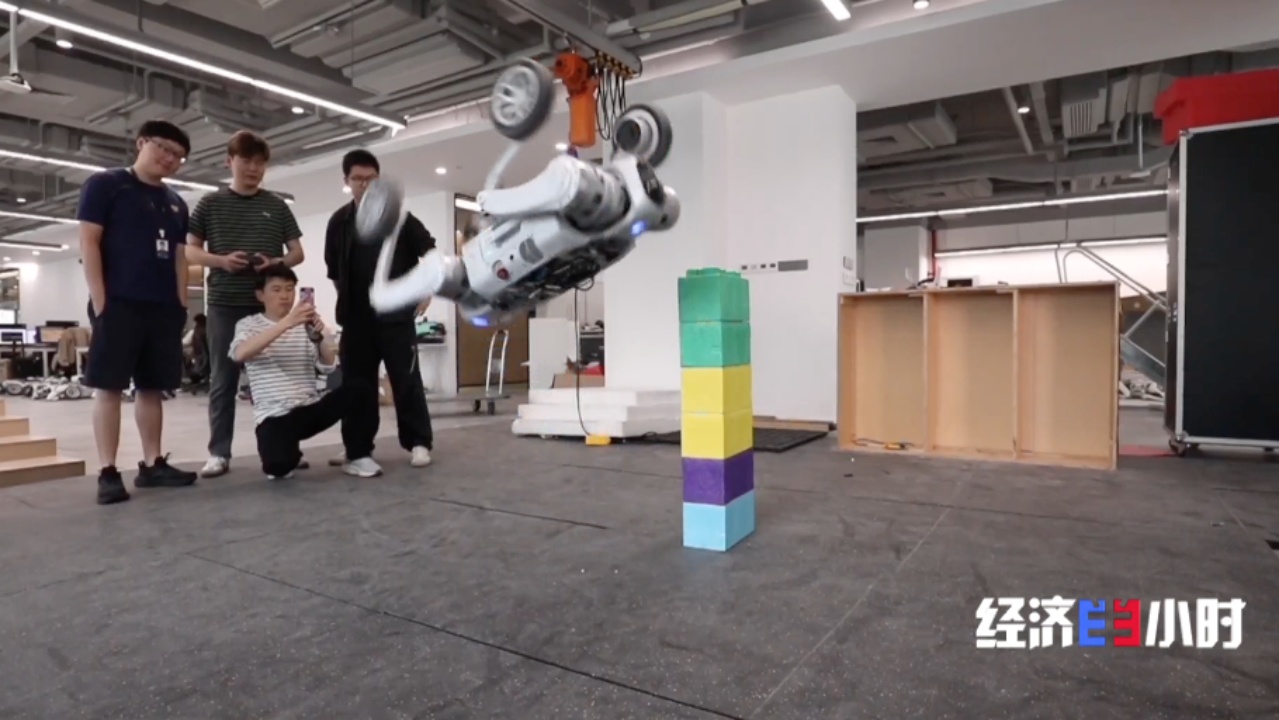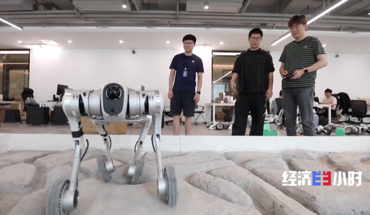 工程师们正给机器狗四只爪子装上轮子,想让它在沙地、沟壑等复杂地形中能移动更快更稳。这台机器狗由三万多个零部件构成,还在不断迭代升级,今年预计有近万台出货量。