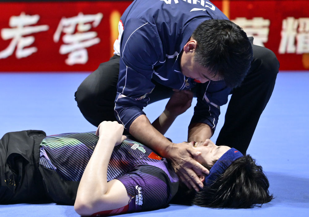 中国选手王楚钦(下)在赛后与教练王皓庆祝胜利。 新华社记者 于洋 摄