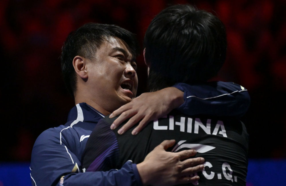中国选手王楚钦(右)在赛后与教练王皓庆祝胜利。 新华社记者 于洋 摄