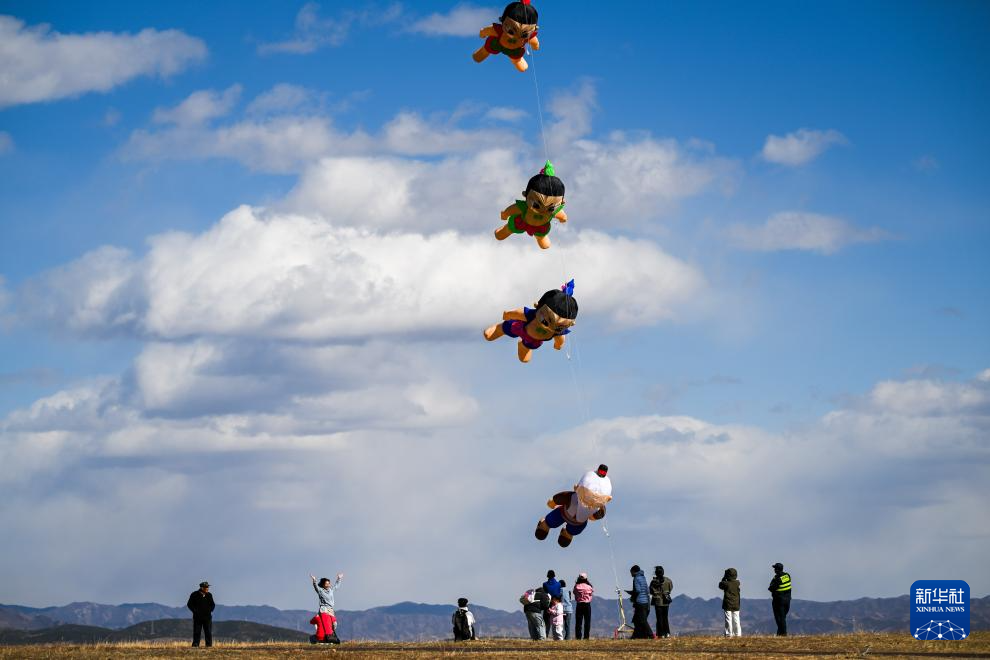 4月5日,人们在内蒙古呼和浩特敕勒川草原观看大型风筝放飞。新华社记者 连振 摄
