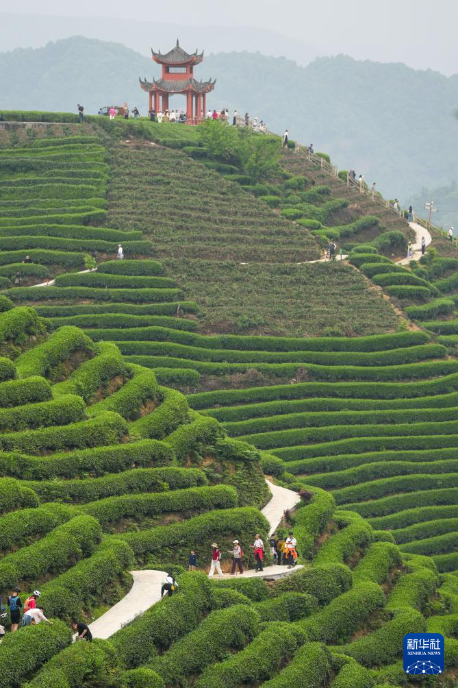 4月5日,人们在四川省雅安市牛碾坪万亩观光茶园游览。新华社记者 胥冰洁 摄