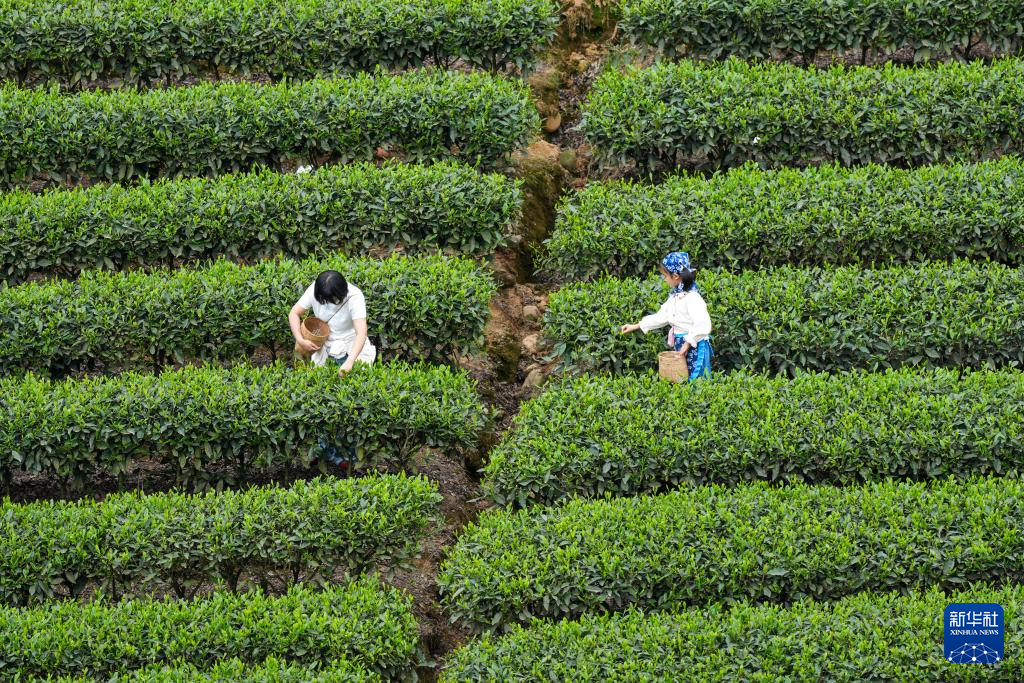 4月5日,人们在四川省雅安市牛碾坪万亩观光茶园体验采茶。新华社记者 胥冰洁 摄