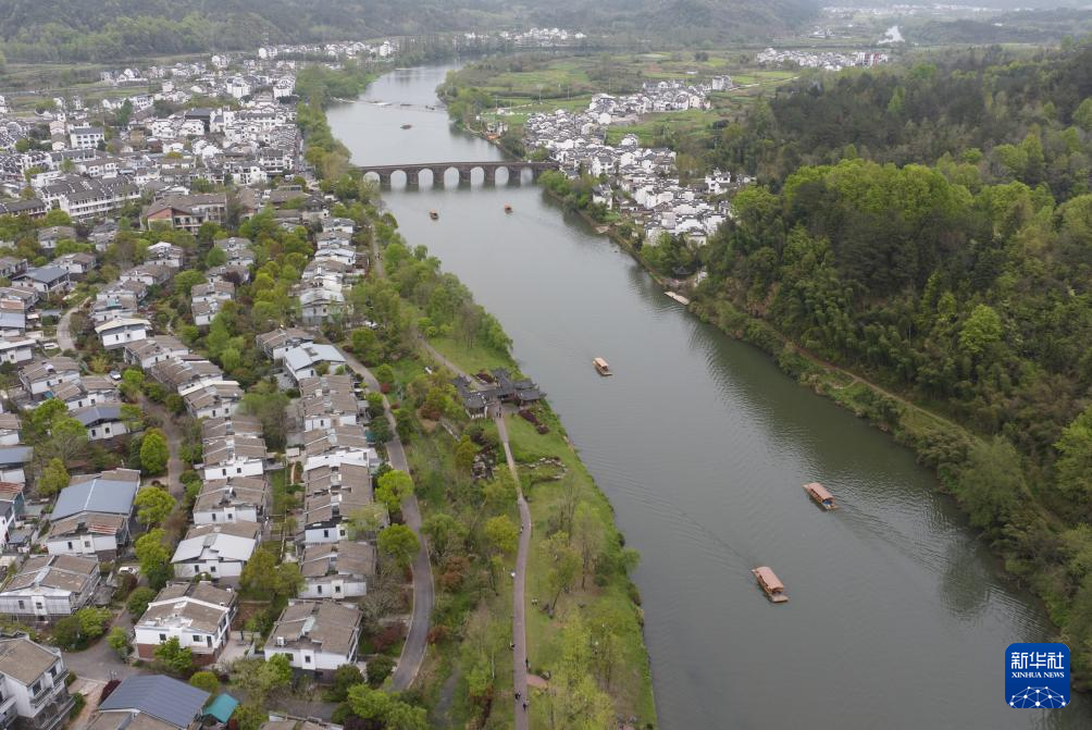 4月4日,游客在安徽省黄山市黟县宏村南湖游玩(无人机照片)。新华社记者 杜宇 摄