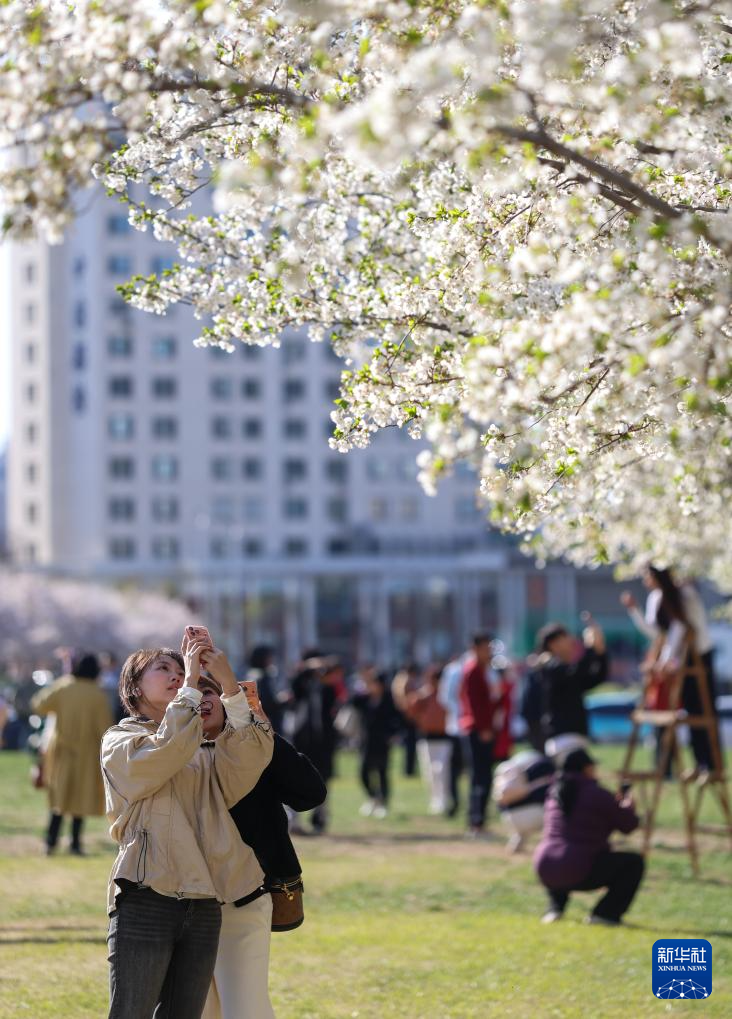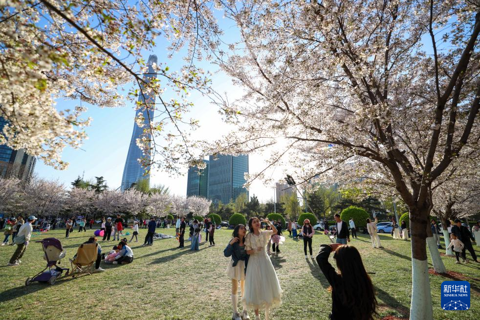 4月5日,市民在天津滨海新区泰达城市广场赏花。新华社记者 孙凡越 摄