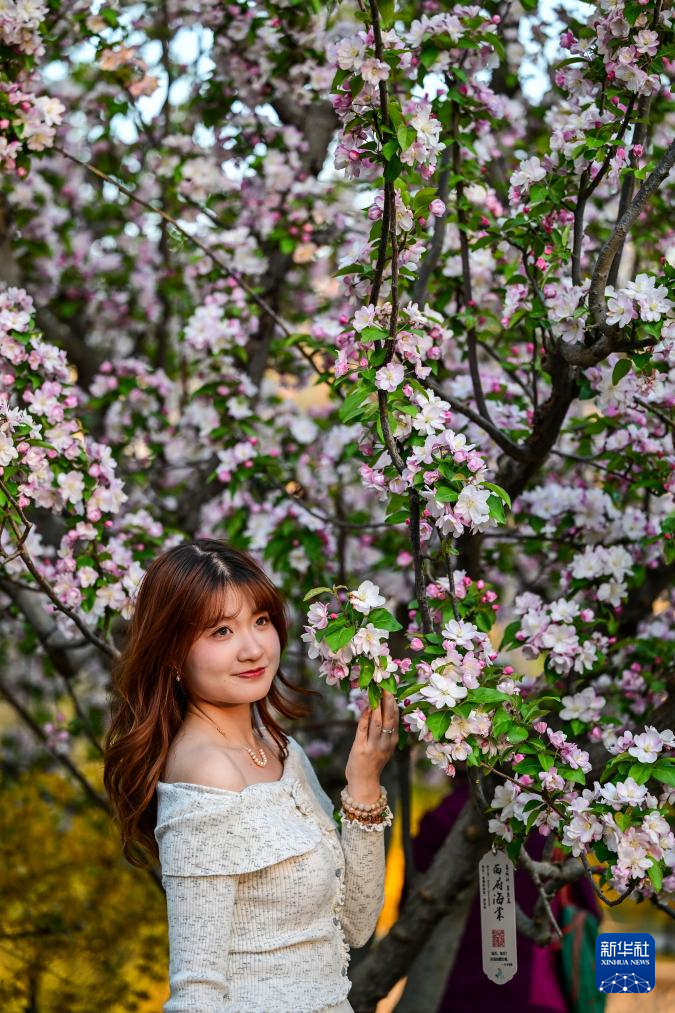 4月5日,游客在北京元大都城垣遗址公园一棵海棠树前留影。新华社记者 陈晔华 摄