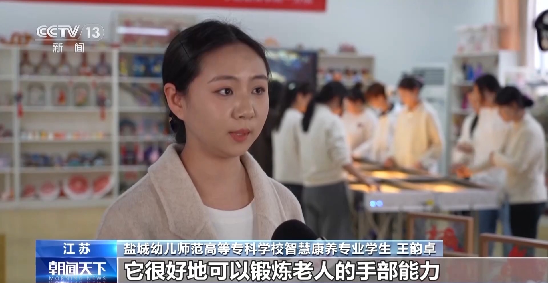 盐城幼儿师范高等专科学校智慧康养专业学生 王韵卓:它可以很好地锻炼老人的手部能力,还可以放松心情,是康养服务的创新手段。