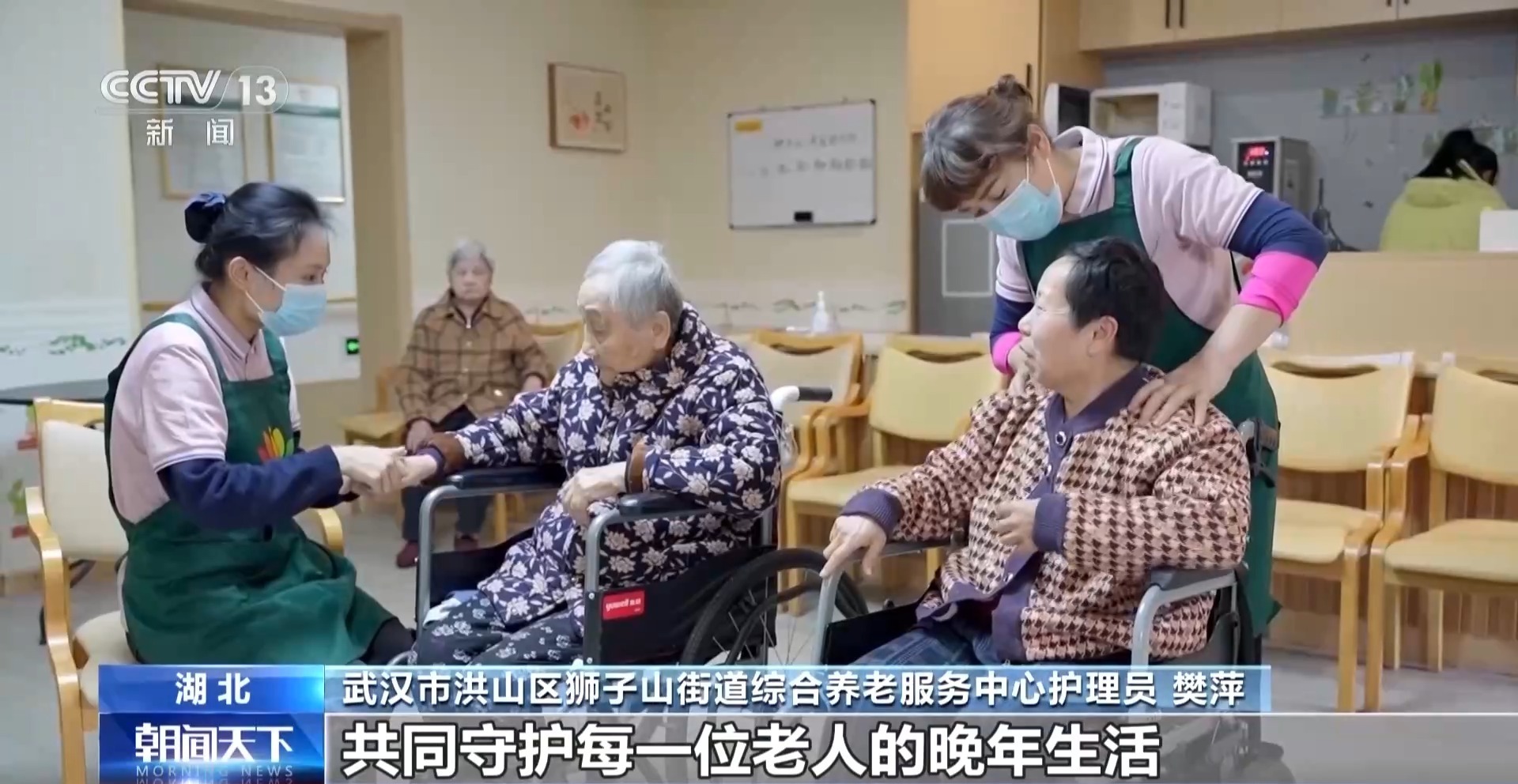 武汉市洪山区狮子山街道综合养老服务中心护理员 樊萍:我觉得未来五年,更多的先进智能养老设备也会投入进来,我们就可以把更多精力放在陪伴老人上,我也希望以后能有更多的像我这样的00后年轻人加入这个行业,共同守护每一位老人的晚年生活。