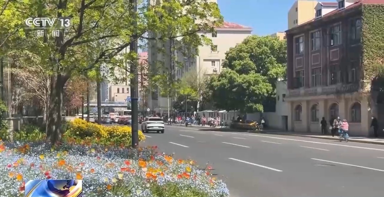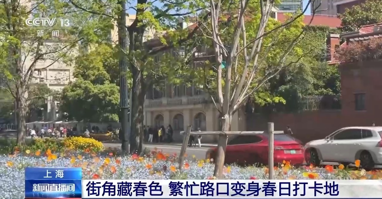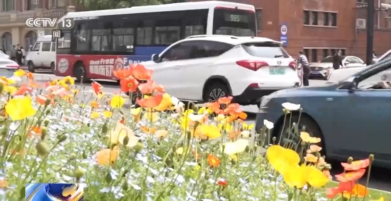 路中隔离带上,大片虞美人等花卉竞相盛开,微风拂过,蓝的、黄的、橙的,各种颜色交织在一起,为春日添上一笔温柔而烂漫的色彩。而在十字路口的人行横道旁,金鱼草、角堇、郁金香等花卉也悄然绽放,为城市街角注入了灵动的春意。