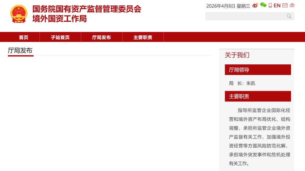 根据官网显示,境外国资工作局主要职责是指导所监管企业国际化经营和境外资产布局优化、结构调整,承担所监管企业境外资产监督有关工作,加强境外投资经营等方面风险防范化解,承担境外突发事件和危机处理有关工作。(记者王希)