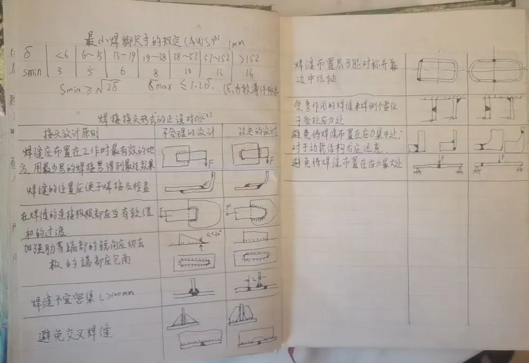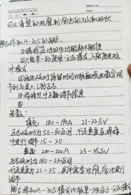 杨建立从兜里掏出一个封皮磨损、内页卷边的笔记本,“这是我10年前的焊接笔记。”他翻开一页,上面密密麻麻记录着当天的电流参数、气温、钢材型号,甚至还有一道焊缝的手绘示意图。他把笔记本递给前排的人传阅。